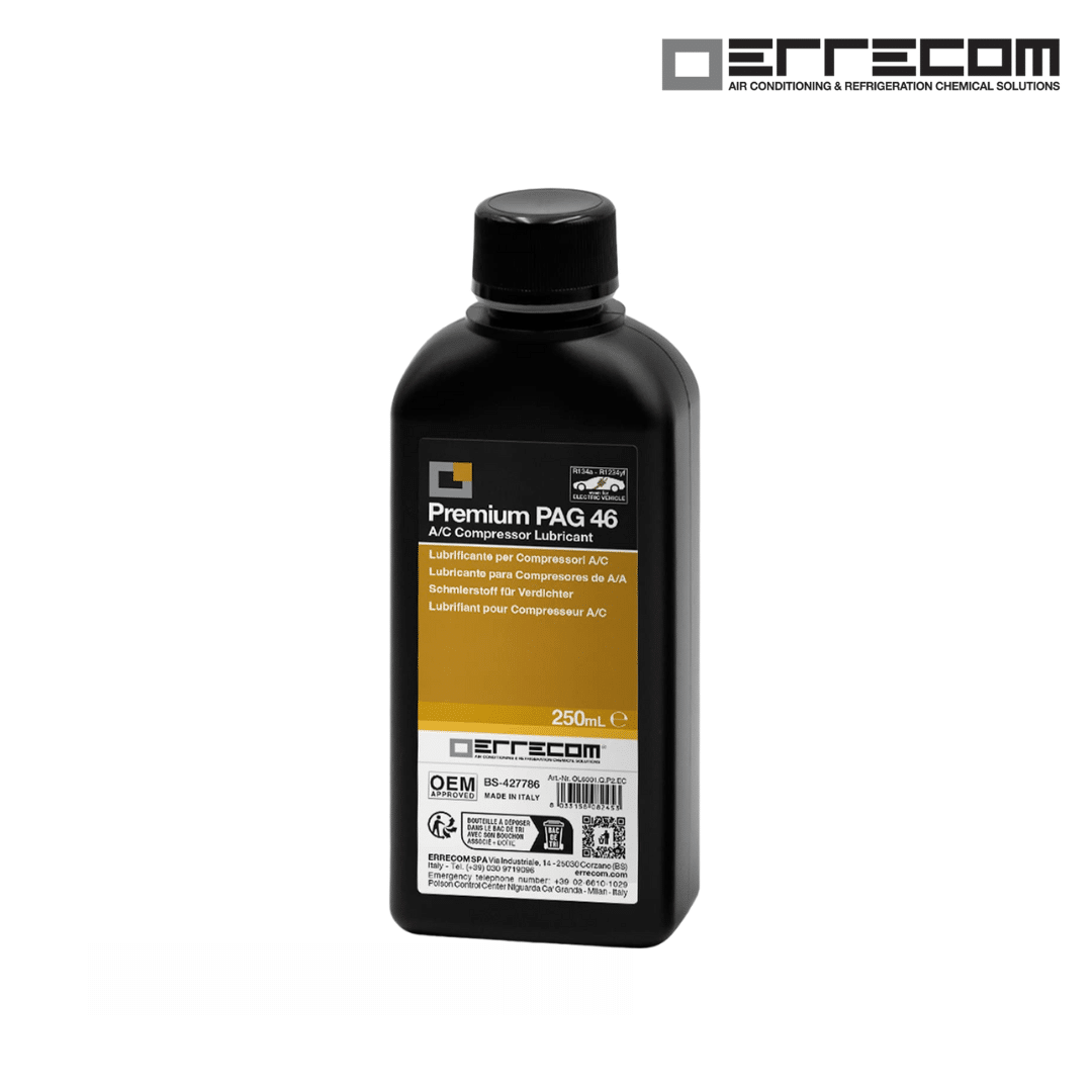 Los lubricantes PAG se han desarrollado para aplicaciones automotrices, especialmente con el uso del gas refrigerante R134a. Los aceites PAG de Errecom son una mezcla de polialquilenglicoles y aditivos especialmente formulados para lograr una mejor lubricidad, estabilidad química y térmica, así como una excelente protección antidesgaste de los componentes del sistema de aire acondicionado/refrigeración (AA/R).