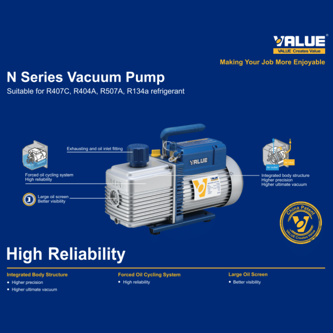 La bomba de vacío VALUE está diseñada para funcionar con refrigerantes como HFC y HCFC ( p. ej. , R410A , R407C ) . Esta bomba de vacío de doble etapa de alto rendimiento se utiliza en refrigeración y aire acondicionado .