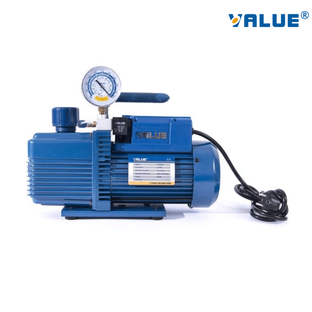 Bomba de vacío modelo V-I260SV de Value, equipada con manómetro incorporado para un control preciso del proceso de evacuación. Con 3/4 HP de potencia y 6 CFM, está diseñada para realizar evacuaciones rápidas y eficientes en sistemas de refrigeración y aire acondicionado, eliminando aire, humedad y contaminantes. La válvula solenoide sirve principalmente como mecanismo de seguridad automático para prevenir el reflujo de aceite hacia el sistema y mantener el nivel de vacío alcanzado cuando la bomba se apaga inesperadamente o al finalizar el trabajo.