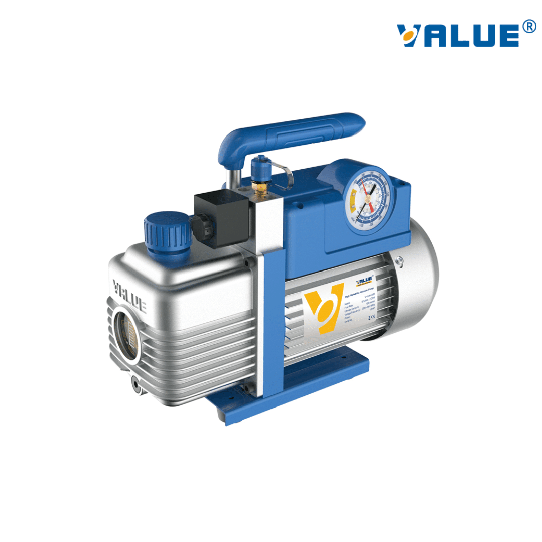 Bomba de vacío modelo V-I220-R32 de Value, diseñada especialmente para trabajar con refrigerante R32. Incorpora manómetro integrado para un mejor control del proceso de evacuación. Con 1/4 HP de potencia y 2 CFM, permite realizar evacuaciones eficientes en sistemas de refrigeración y aire acondicionado, eliminando aire y humedad para garantizar un óptimo rendimiento del sistema.