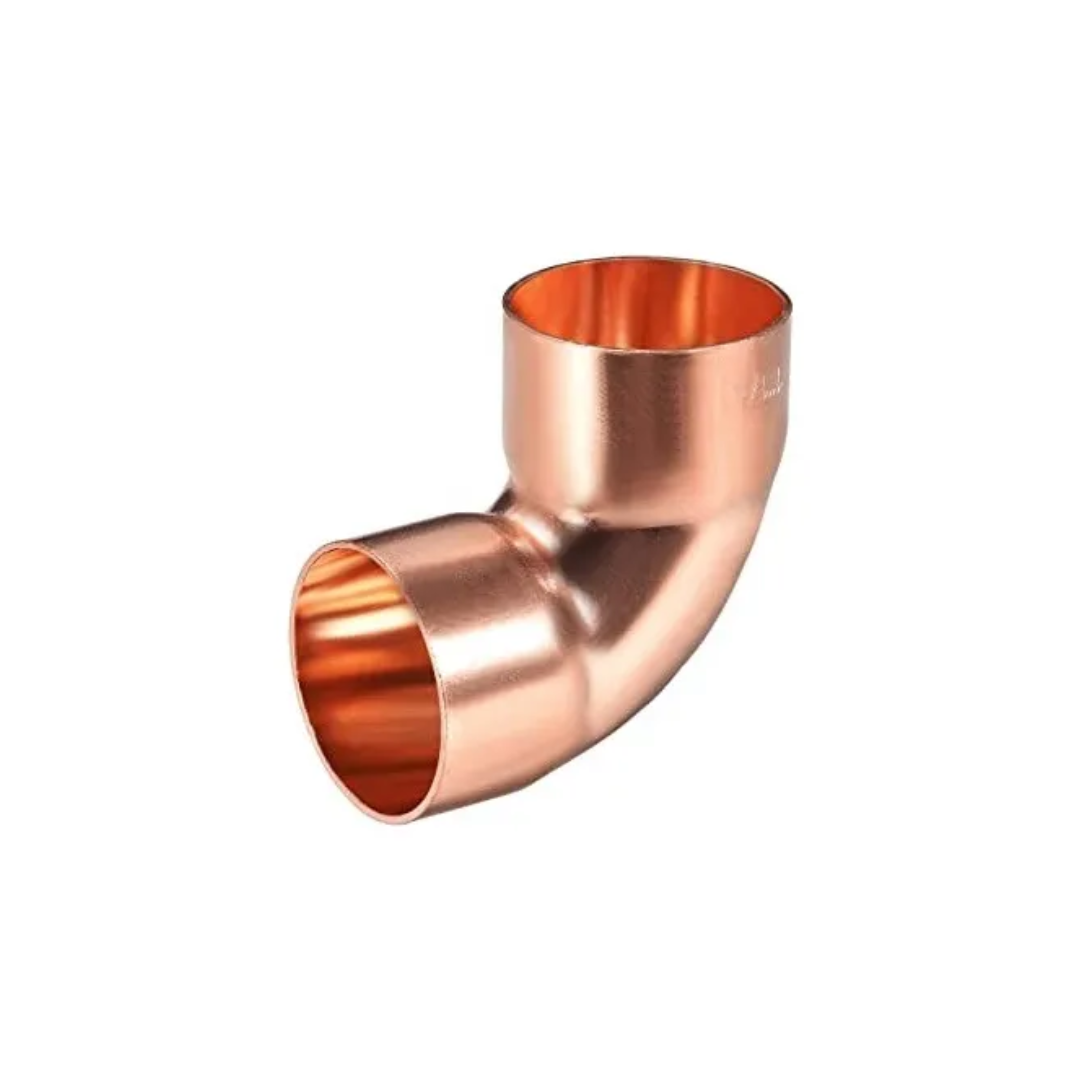 Codo de cobre soldable de 90° y 5/8”, diseñado para realizar cambios de dirección en sistemas de tuberías de cobre. Ideal para instalaciones de gas, agua y refrigeración, garantiza una conexión segura, resistente y duradera mediante soldadura.