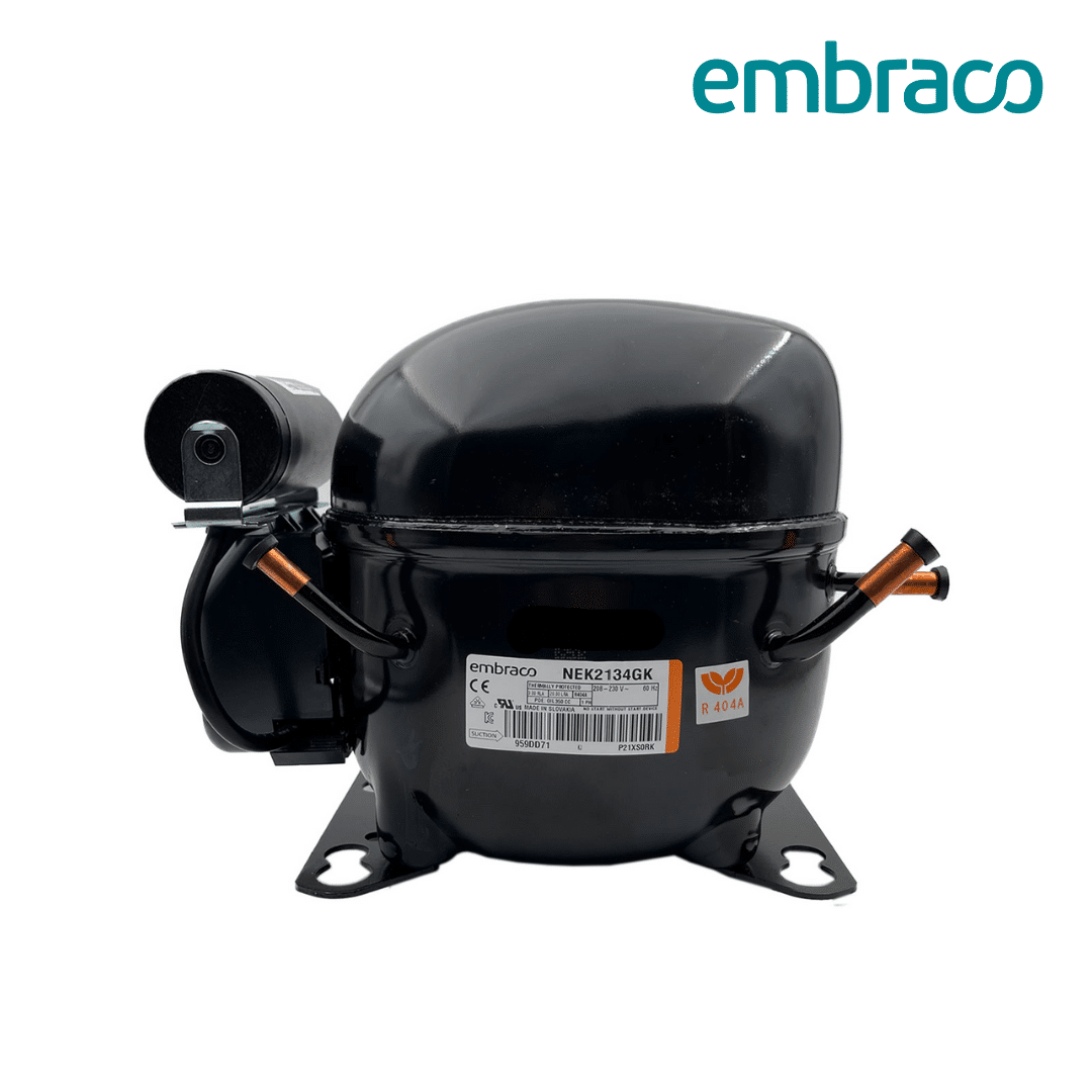Compresor fraccionario Embraco modelo NEK2134GK de 1/2 HP, diseñado para operar con refrigerante R-404A en aplicaciones de baja presión (LBP). Ofrece alto rendimiento, gran capacidad de refrigeración y confiabilidad en trabajos continuos, siendo ideal para congeladores comerciales, vitrinas y equipos de refrigeración industrial ligera.