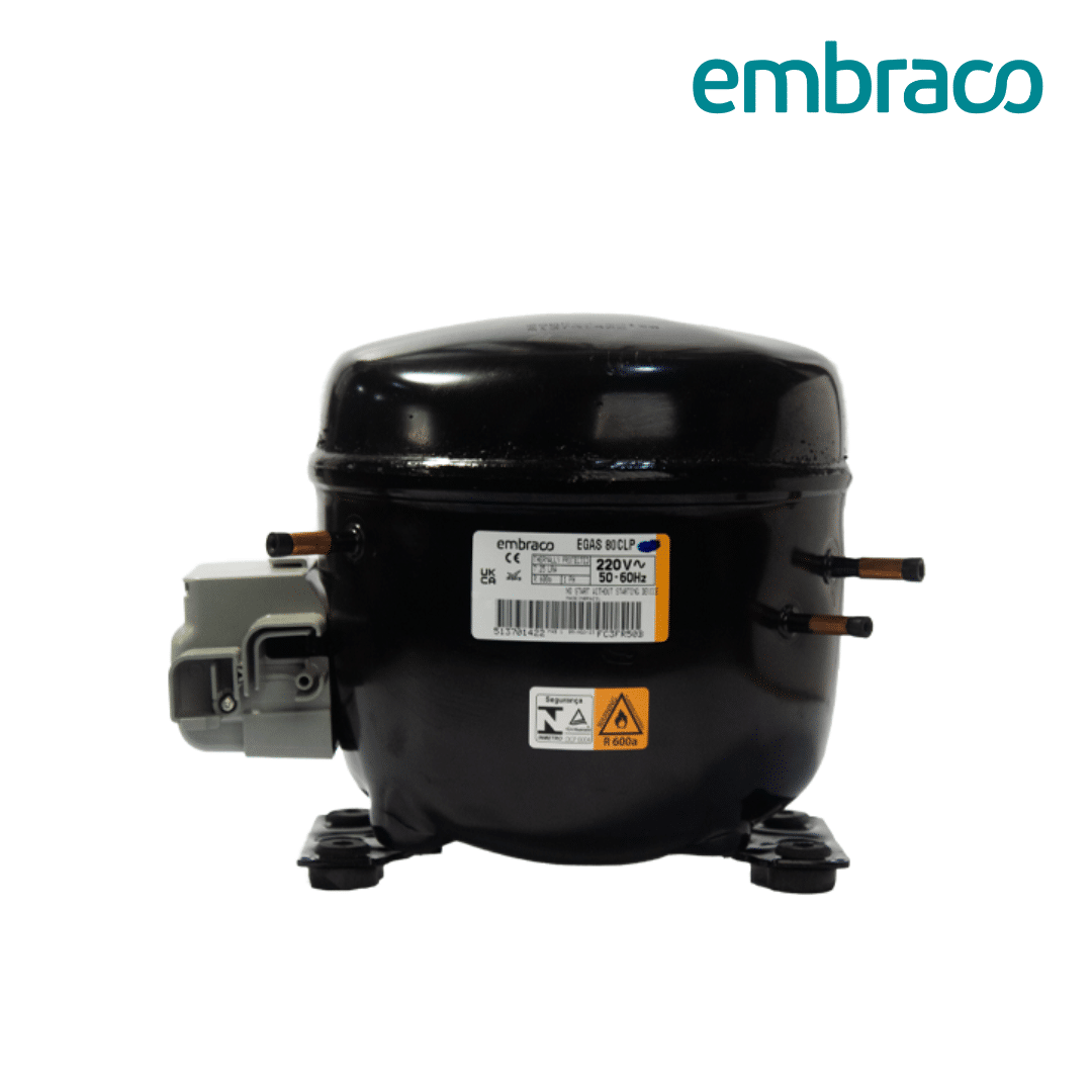 Compresor fraccionario Embraco modelo EGAS80CLP de 1/4 HP, diseñado para operar con refrigerante R-600a en aplicaciones de baja presión (LBP). Destaca por su bajo consumo energético, funcionamiento silencioso y alto rendimiento, siendo ideal para refrigeradores, vitrinas y congeladores pequeños.