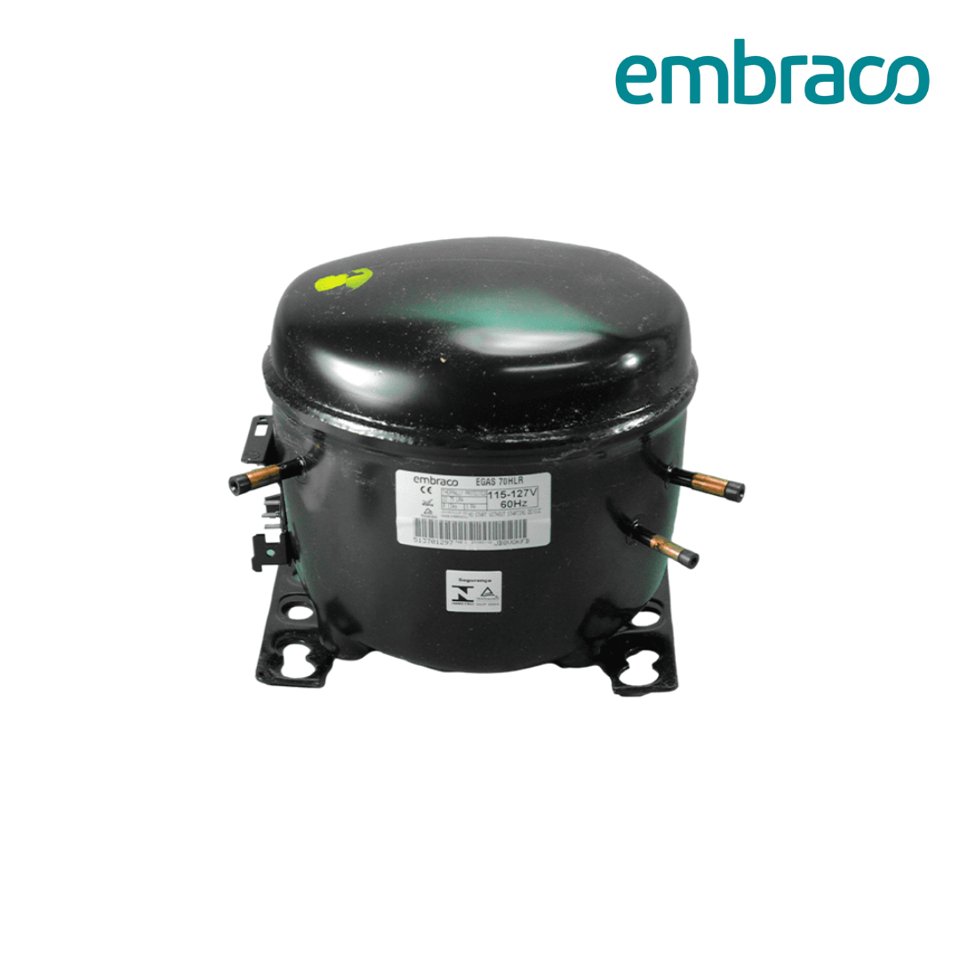 Compresor hermético Embraco EGAS70HLR, diseñado para aplicaciones de baja presión (LBP) en sistemas de refrigeración doméstica y comercial ligera. Ofrece un funcionamiento eficiente, silencioso y confiable, ideal para equipos que utilizan refrigerante R134a.