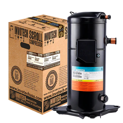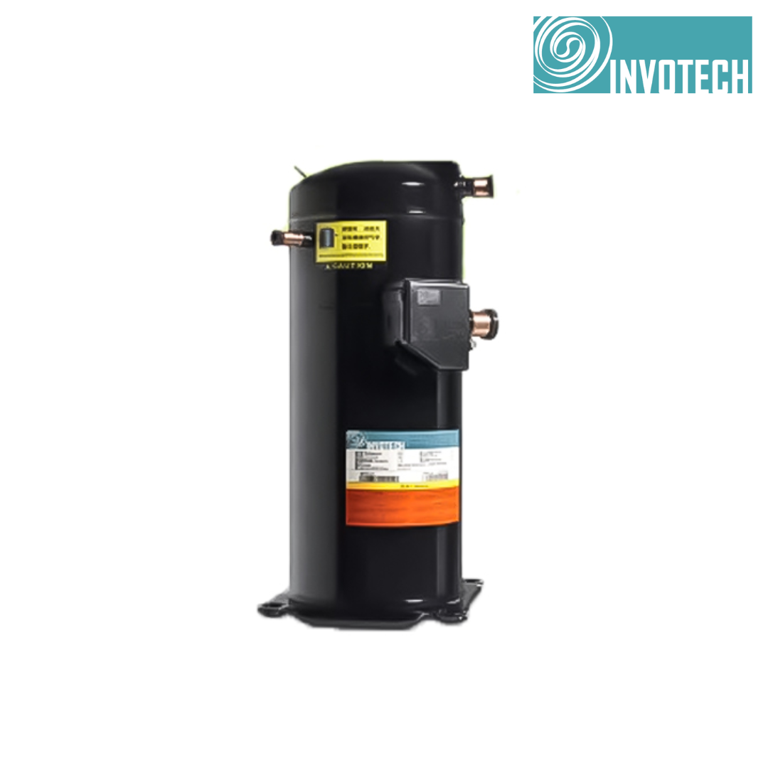 Compresor scroll INVOTECH modelo YH150C7-100, con capacidad de 60,000 BTU y potencia de 5 HP, diseñado para sistemas de aire acondicionado y refrigeración que utilizan refrigerante R410A. Opera a 220 V / 3 fases / 60 Hz, ofreciendo alto rendimiento, eficiencia energética y operación confiable en aplicaciones comerciales e industriales.