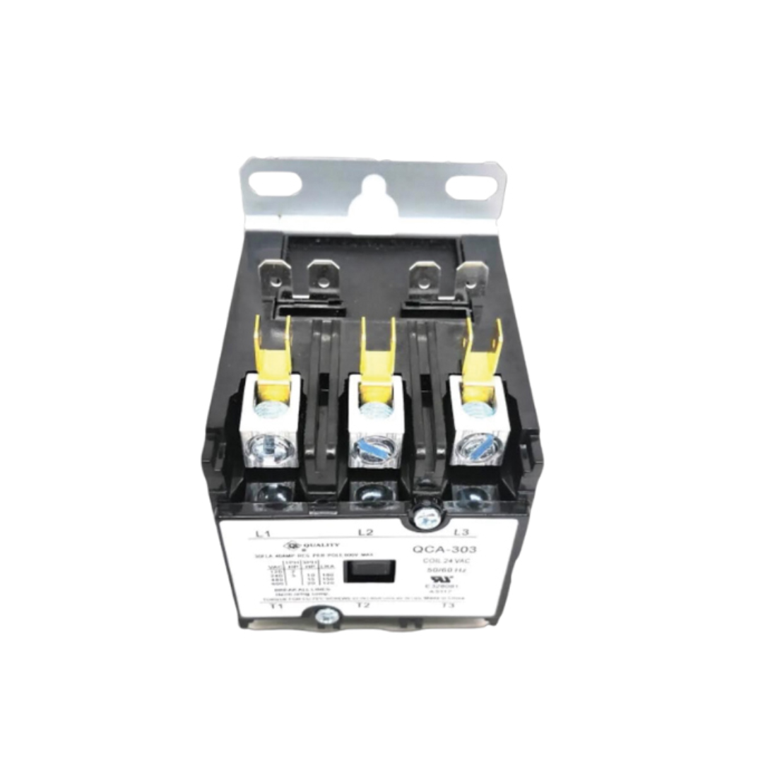 Contactor eléctrico de 30 amperios y 3 polos, diseñado para la conmutación y control de cargas eléctricas en sistemas de refrigeración, aire acondicionado y aplicaciones industriales. Incorpora bobina de 24 V, garantizando un funcionamiento seguro, estable y confiable en maniobras eléctricas.