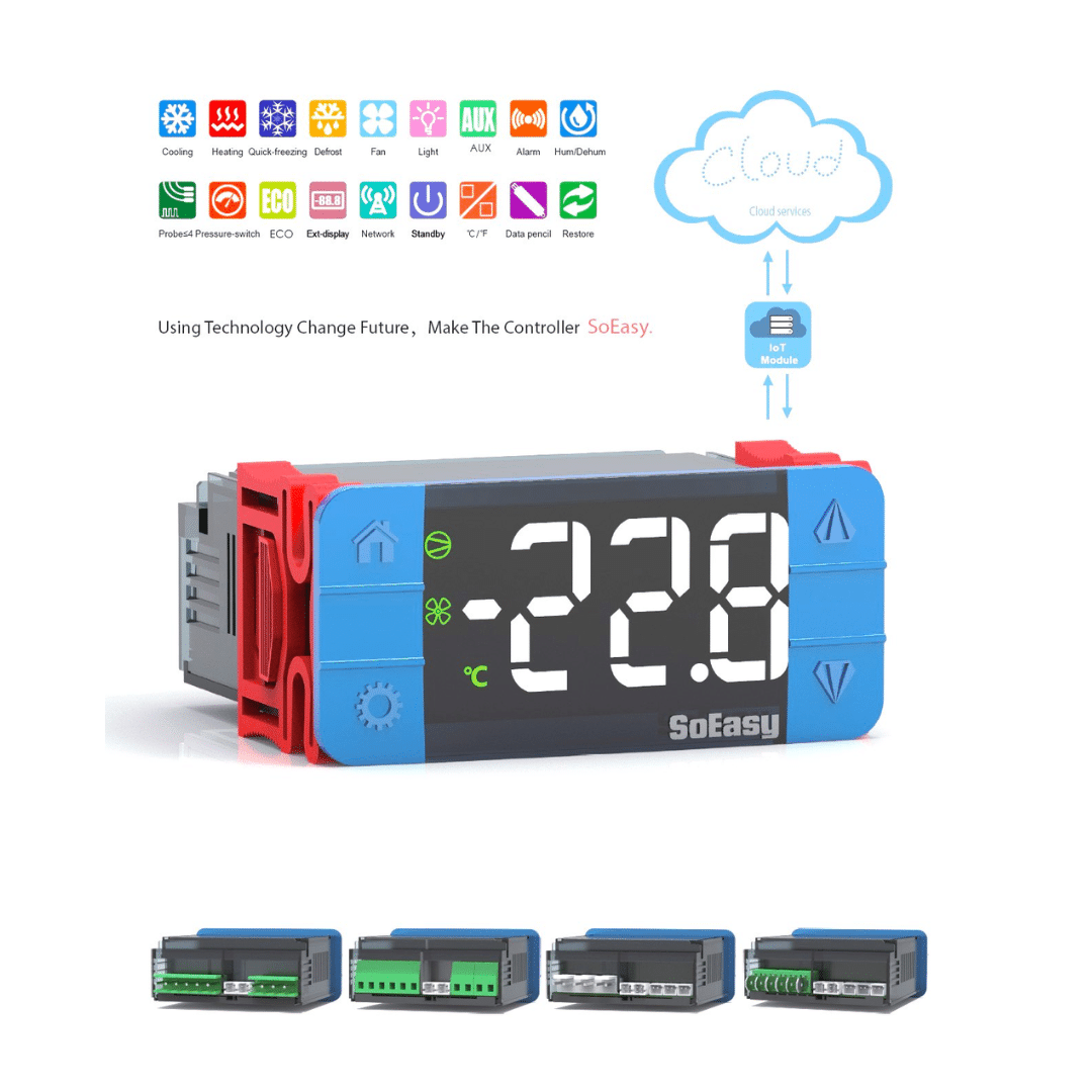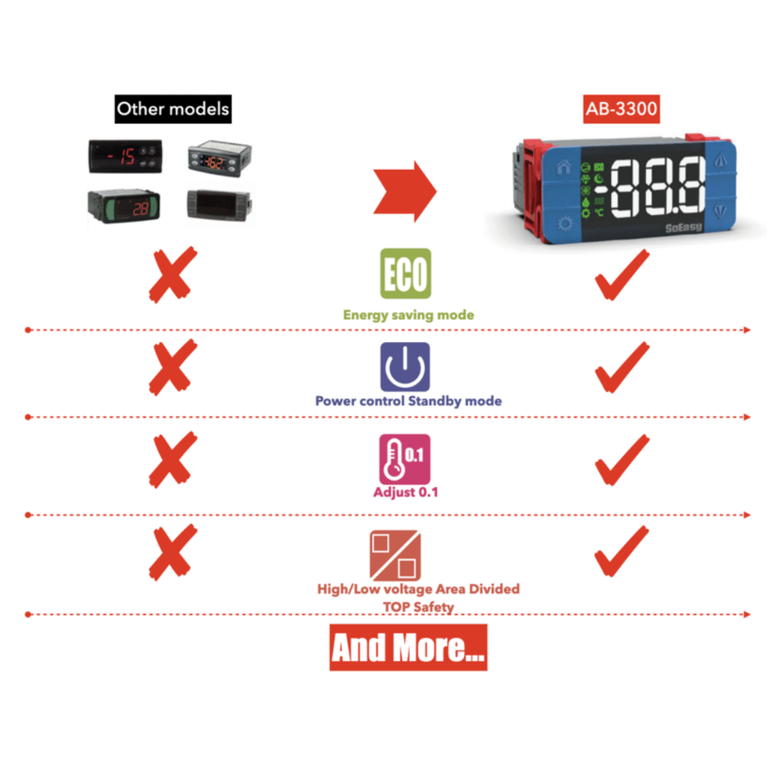 El AB2300 es un controlador digital compacto con lógica ON/OFF especialmente diseñado para vitrinas, cámaras y exhibidores de conservación. Su relé de 2 HP / 16 A permite accionar compresores medianos directamente a 220 VAC, mientras que el firmware incluye salidas dedicadas para refrigeración, deshielo/luz y ventilador, optimizando el ciclo térmico y el consumo de energía.