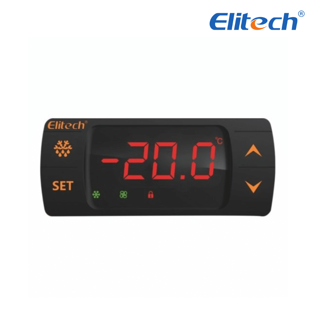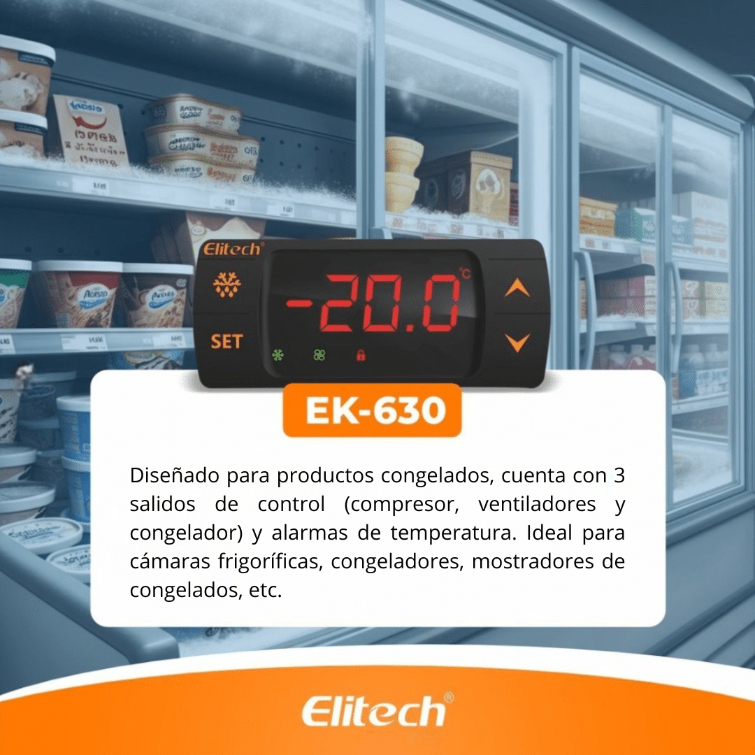 El Elitech EK-630 es un controlador digital diseñado para el control de temperatura en aplicaciones de congelación, ideal para cámaras frigoríficas, vitrinas y conservadoras de congelados. Opera a 220V, cuenta con dos sondas NTC (una para temperatura y otra para monitorear el deshielo), y soporta hasta 16A de carga.