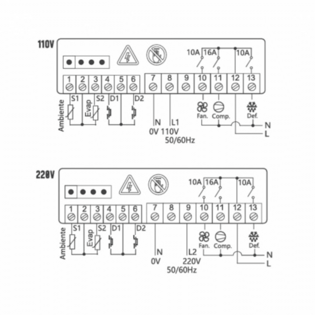 Este modelo gestiona el ciclo completo de refrigeración del equipo mediante sus tres salidas de control para el compresor (o válvula solenoide), los ventiladores del evaporador y el descongelamiento. Utiliza dos sensores para controlar la temperatura ambiente y la del evaporador, lo que generalmente se utiliza para determinar el final del descongelamiento por temperatura o por el retorno del ventilador.