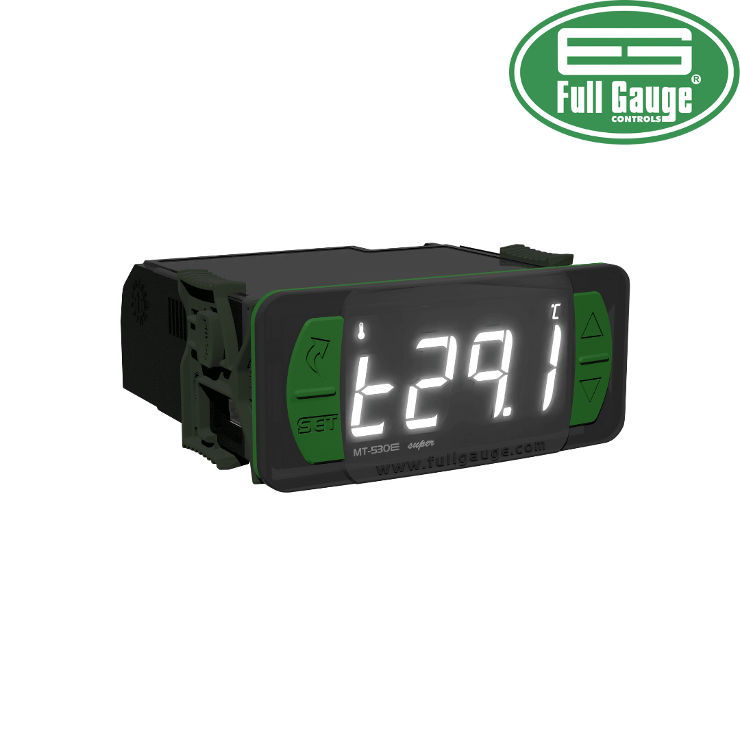 Controlador de temperatura y humedad FULL GAUGE MT530E Super, diseñado para el monitoreo y control preciso en sistemas de refrigeración, cámaras frigoríficas y ambientes que requieren control térmico y de humedad. Funciona a 115/230V, ofreciendo alta confiabilidad y fácil configuración para aplicaciones profesionales.