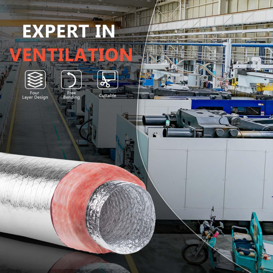 Ducto flexible aislado FACIL FLEX de 16 pulgadas de diámetro y 25 pies (7.62 m) de largo, diseñado para la distribución de grandes volúmenes de aire en sistemas de ventilación, aire acondicionado y calefacción. Su aislamiento térmico reduce pérdidas de energía y condensación, asegurando un desempeño eficiente del sistema HVAC. Ideal para aplicaciones comerciales e industriales.