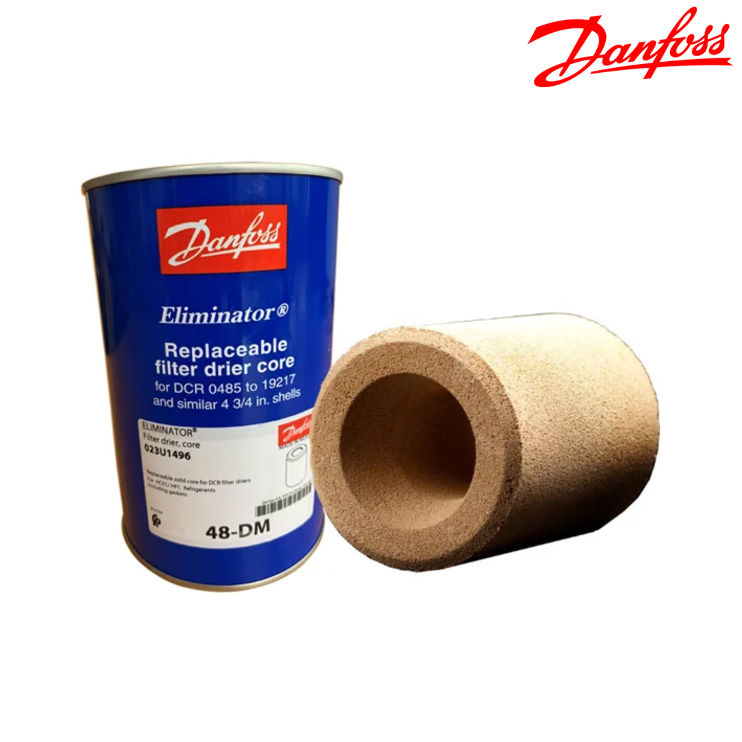 Filtro cerámico DANFOSS modelo 48 DM, diseñado para instalación dirigida en la línea de líquidos en sistemas de refrigeración y aire acondicionado. Su composición 100% tamiz molecular ofrece una alta capacidad de absorción de humedad y control de contaminantes, protegiendo eficazmente el compresor y los componentes del sistema.