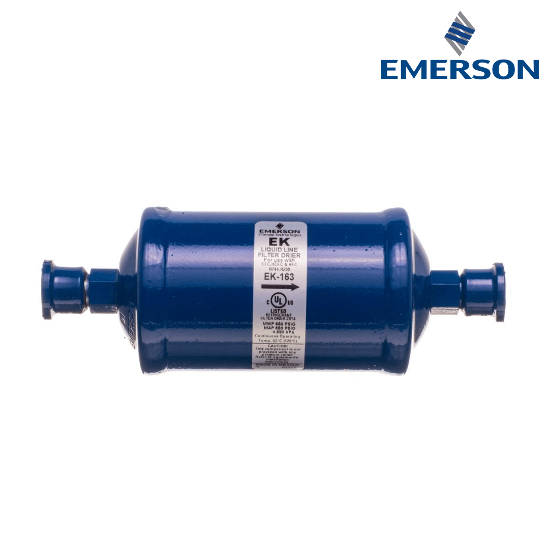 Filtro secador EMERSON EK-163, diseñado para proteger sistemas de refrigeración y aire acondicionado eliminando humedad, ácidos y partículas sólidas del refrigerante. Su conexión roscable facilita la instalación y el mantenimiento, asegurando un funcionamiento confiable del sistema.
