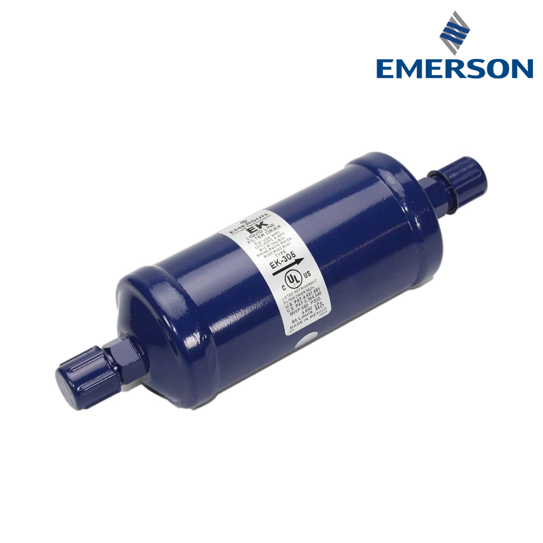 Filtro secador EMERSON EK-305, diseñado para proteger sistemas de refrigeración y aire acondicionado eliminando humedad, ácidos y partículas sólidas del refrigerante. Su conexión roscable permite una instalación rápida y segura en la línea de líquido, asegurando un funcionamiento confiable del sistema.