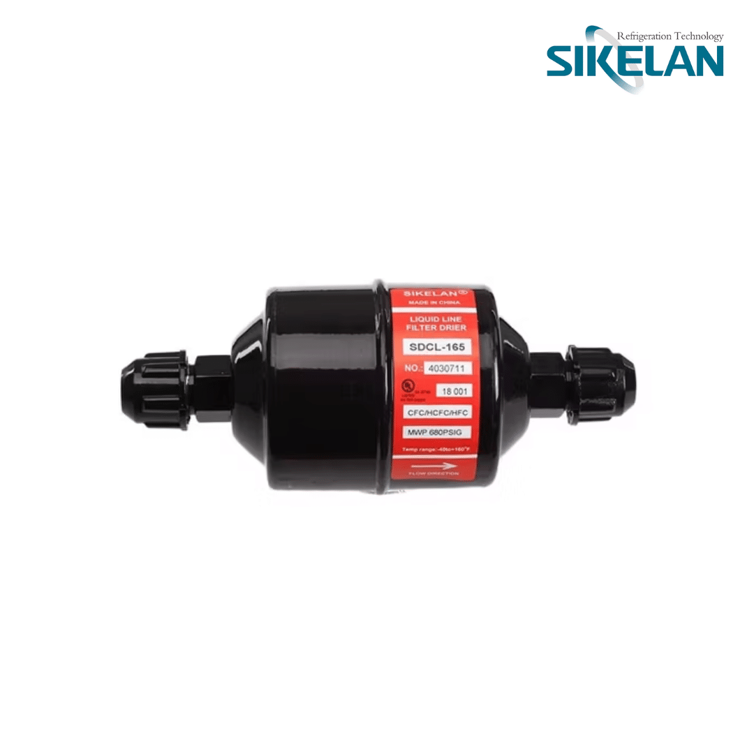El filtro secador SDCL-165 de Sikelan pertenece a la serie SDCL, diseñada con un núcleo sólido de alta capacidad de absorción, que combina tamiz molecular y alúmina activa. Su función principal es eliminar la humedad, ácidos y partículas contaminantes del sistema de refrigeración o aire acondicionado, manteniendo la pureza del refrigerante y protegiendo los componentes del sistema contra corrosión y daños prematuros.