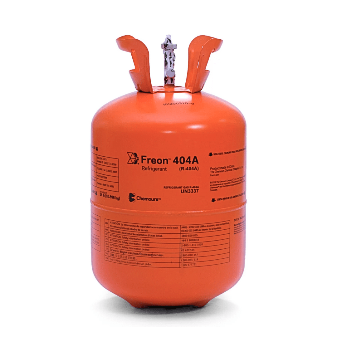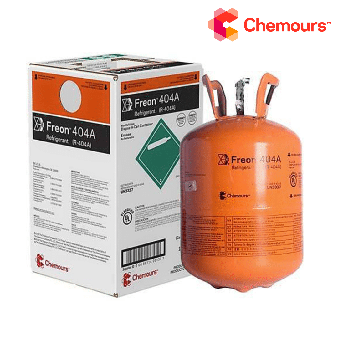 Freon™ 404A (R-404A) es un refrigerante de hidrofluorocarbono (HFC) mezclado compuesto de R-125, R-134a y R-143a. Fue diseñado para reemplazar el R-502 y el R-22 que se utilizan en equipos de refrigeradores comerciales para rangos de temperatura baja y media. Gracias a sus propiedades, es ideal para exhibidores, vehículos refrigerados, máquinas de hielo y otras aplicaciones.