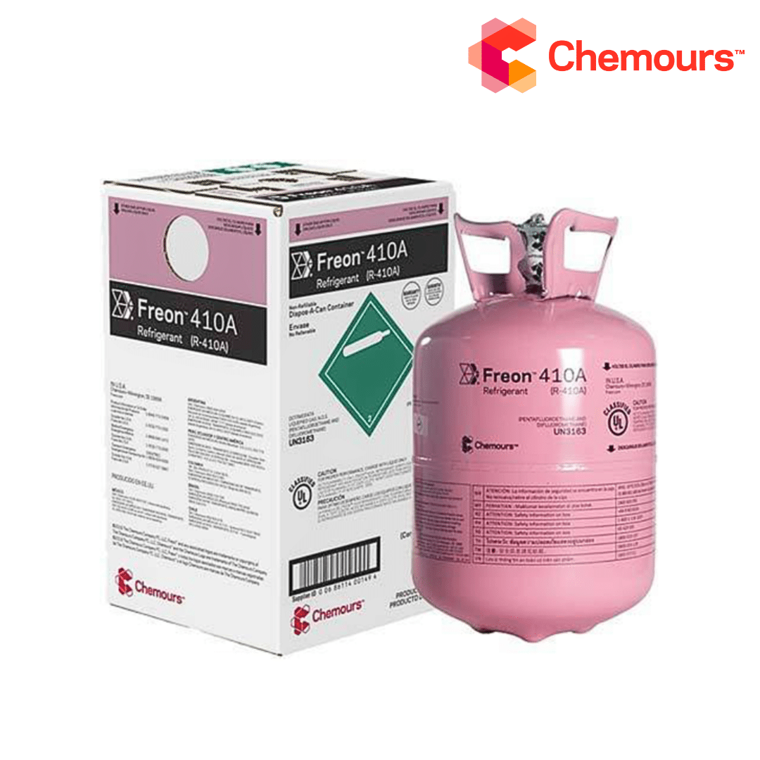 El refrigerante Freon™ 410A (R-410A) ofrece una mayor capacidad de enfriamiento y una presión significativamente mayor que el R-22 para su uso en sistemas diseñados específicamente para R-410A. Este refrigerante de hidrofluorocarbono (HFC) es compatible con aceites de poliolefina (POE) y reemplaza al R-22 en sistemas de aire acondicionado (AC) de desplazamiento positivo y de bomba de calor para uso residencial y comercial ligero.