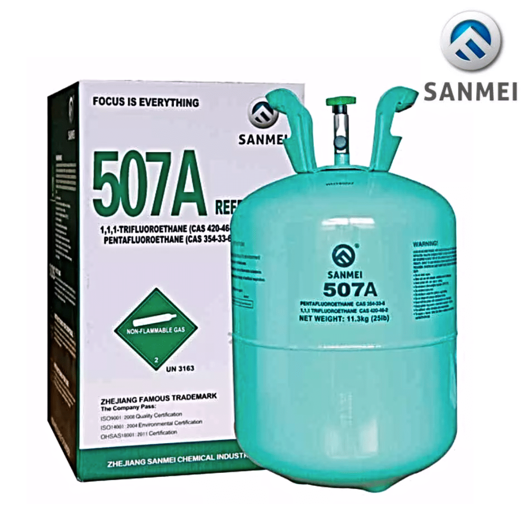 El gas refrigerante r507 nace como sustituto del R502 y R22 y puede ser manejado por el usuario igual que el R502. Además, dispone de propiedades físicas similares. Además contiene productos químicos muy utilizados en la industria de aire acondicionado y refrigeración industrial y comercial debido a su capacidad de enfriamiento, seguridad y eficiencia. También el R-507A es una mezcla azeotrópica compuesta por R125 y R143a y se utiliza principalmente en equipos nuevos y adecuación de equipo instalado. El fluido refrigerante R507A es una mezcla azeotrópica y sin Glide, comportándose como un producto puro, lo que permite realizar la carga tanto en fase líquida como en vapor. No hay cambios de composición en caso de fugas.