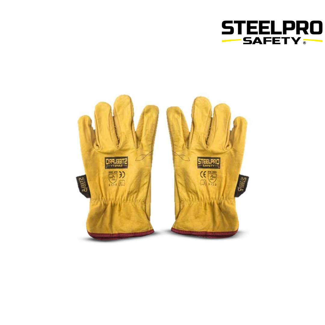 Guante de cuero STEELPRO fabricado en badana, diseñado para ofrecer protección, resistencia y comodidad en trabajos industriales, mecánicos y de mantenimiento. Su diseño en color amarillo proporciona mayor visibilidad y un excelente agarre durante el uso.