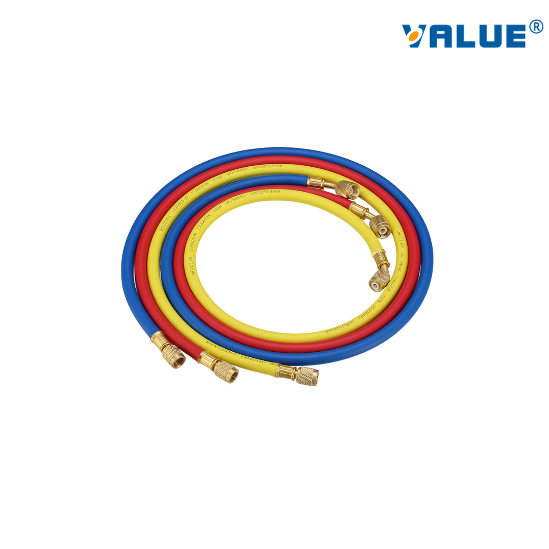 Juego de manguera para refrigeración de Value, diseñado para conectar manómetros y equipos de servicio durante trabajos de carga, vacío y diagnóstico en sistemas de refrigeración y aire acondicionado (HVAC). Con longitud de 0.9 metros, estas mangueras ofrecen flexibilidad y resistencia para uso profesional. Están fabricadas con materiales de alta calidad que soportan presiones de trabajo elevadas y garantizan un flujo seguro de refrigerante durante las operaciones de mantenimiento.