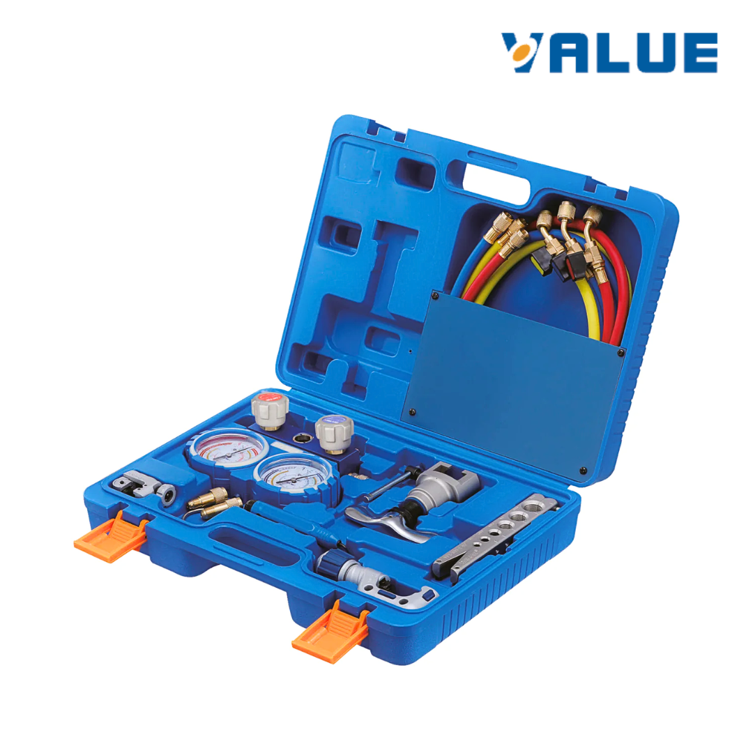 Kit profesional VALUE VTB-5B-III diseñado para instalación y mantenimiento en sistemas de refrigeración y aire acondicionado. Incluye herramientas esenciales para corte, abocardado, medición y conexión, todo organizado en un maletín práctico para uso técnico.