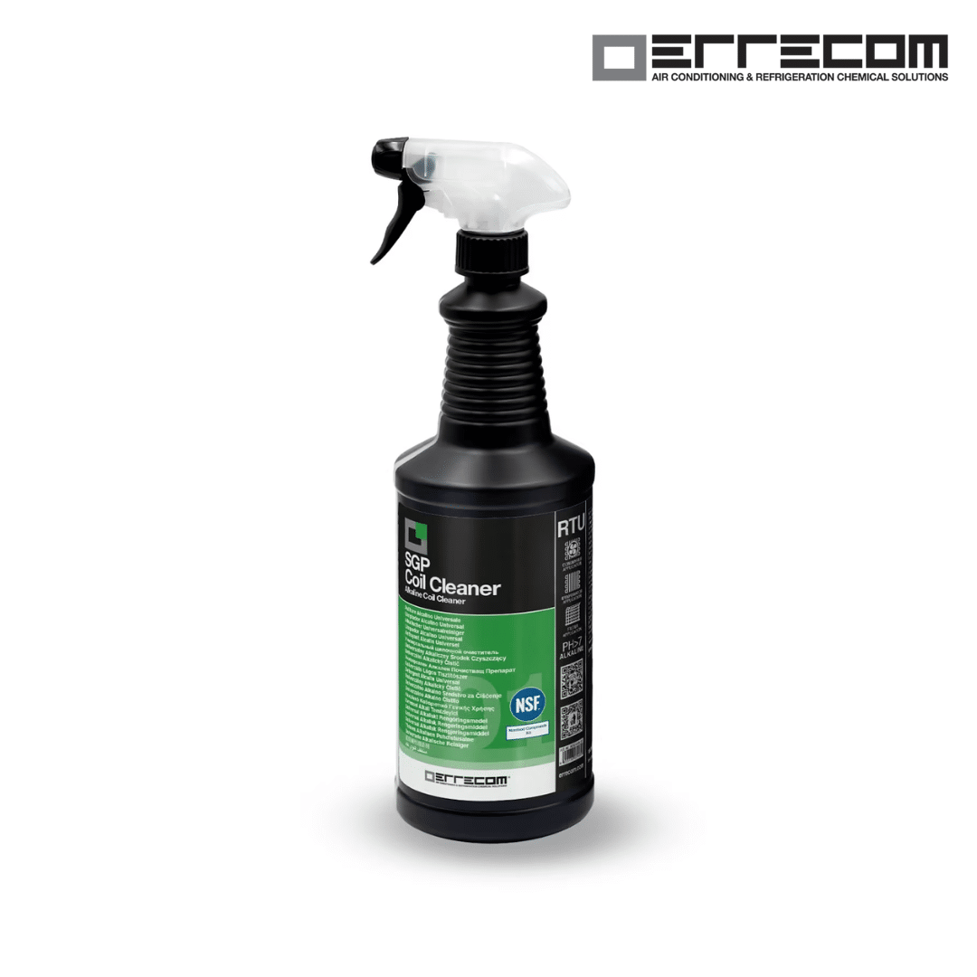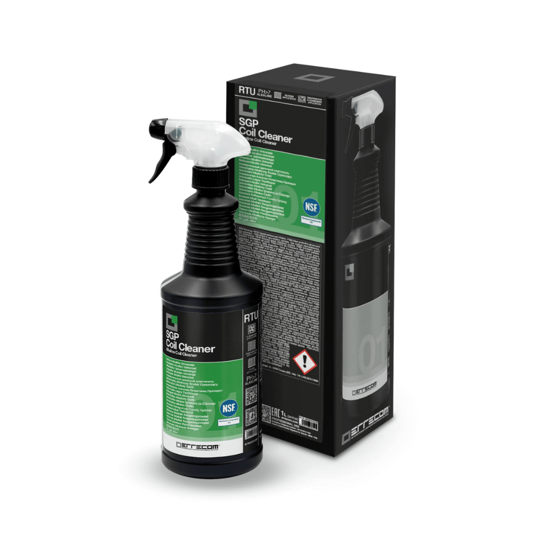 SGP Coil Cleaner es un limpiador alcalino universal concentrado, desarrollado por Errecom para la limpieza completa de filtros, evaporadores y condensadores. Gracias a su formulación con tensioactivos biodegradables, realiza una acción de limpieza a la vez fuerte y segura para todas las superficies y componentes del sistema, regenerando su apariencia y eficiencia. SGP Coil Cleaner desengrasa eficazmente, eliminando también los depósitos más persistentes de residuos orgánicos, grasa, polvo, polen y smog. Libre de agentes espumantes, permite un enjuague rápido que reduce el consumo de agua y el impacto ambiental. Contiene inhibidores de corrosión que ayudan a prolongar la vida del sistema.