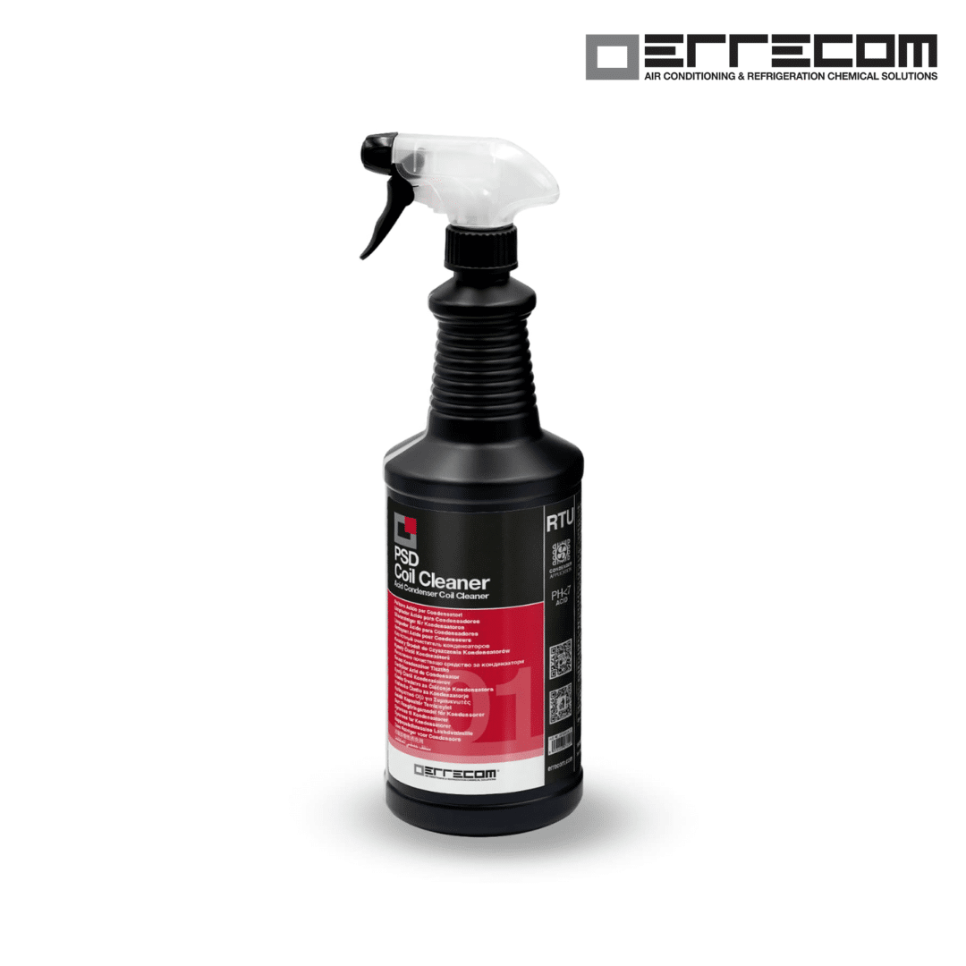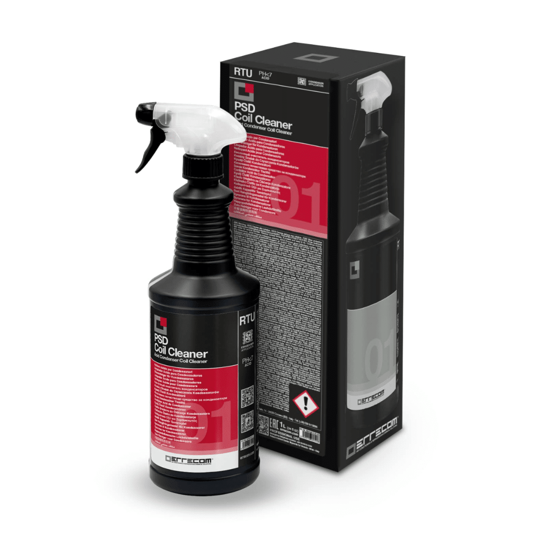 PSD COIL CLEANER es un limpiador ácido concentrado para condensadores. Su formulación ácida (pH=2) lo hace particularmente efectivo para eliminar incrustaciones de los componentes metálicos de la unidad exterior.