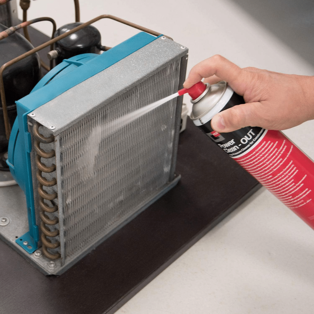 POWER CLEAN OUT es un limpiador de condensadores en una lata de aerosol especial que ha sido diseñado para lograr una presión de suministro alta y constante, que permite eliminar incluso la suciedad más rebelde que se acumula entre las baterías con aletas.