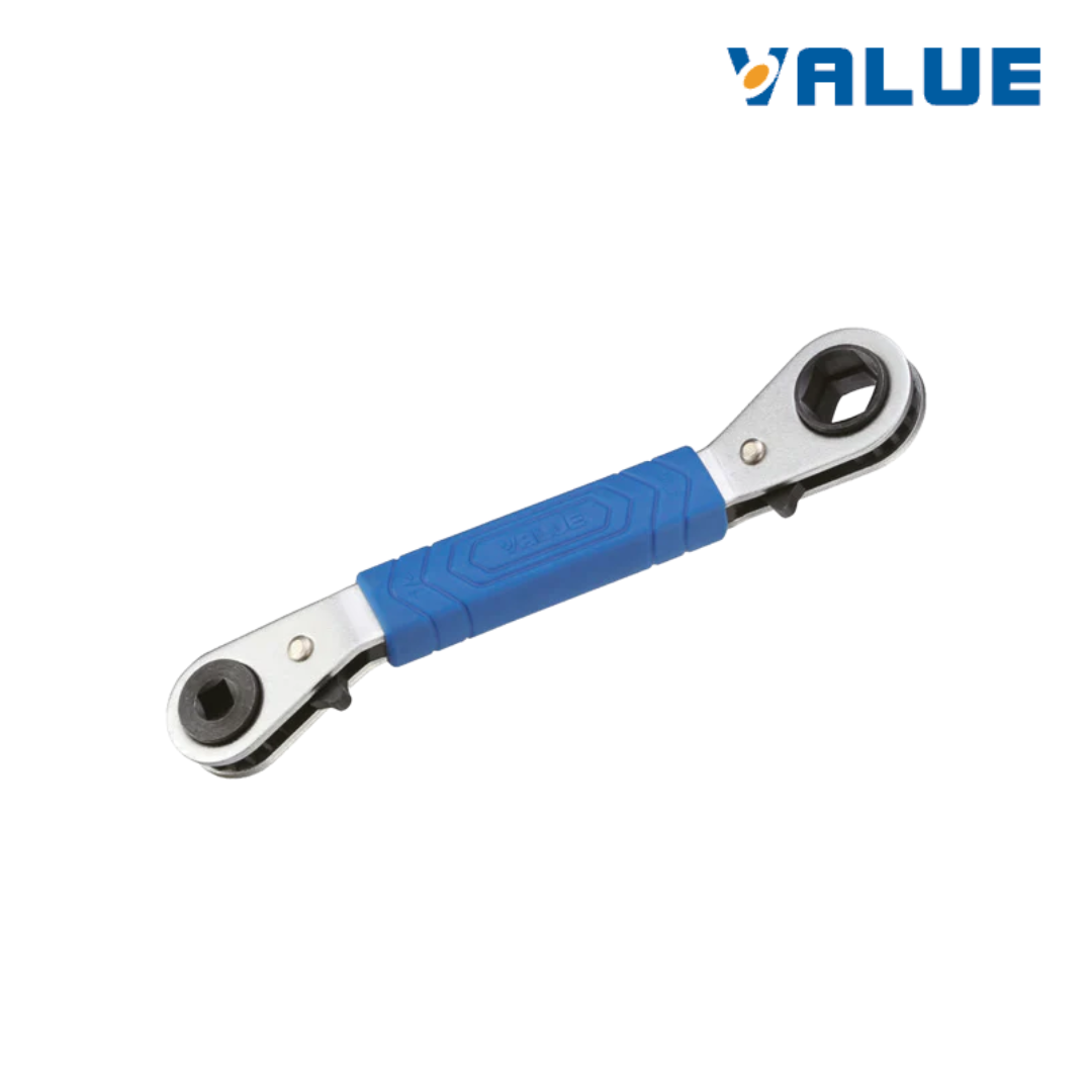 Llave rachet VALUE VRT-202, diseñada para el ajuste rápido y preciso de válvulas de servicio en sistemas de refrigeración y aire acondicionado. Su mecanismo de carraca permite trabajar de forma continua sin retirar la herramienta, ideal para espacios reducidos y trabajos técnicos rápidos.