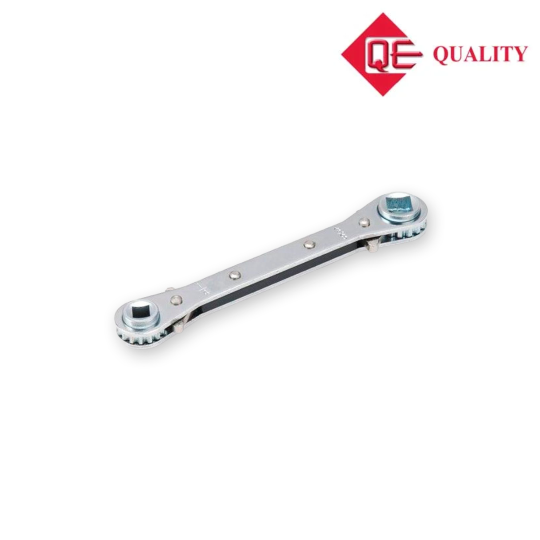 Llave ratchet cuadrada modelo QR8-127 de Quality, diseñada para el ajuste rápido y preciso de válvulas de servicio en sistemas de refrigeración y aire acondicionado. Compatible con medidas 1/4", 3/8", 3/16" y 5/16", permite un trabajo eficiente en espacios reducidos, mejorando la productividad del técnico.
