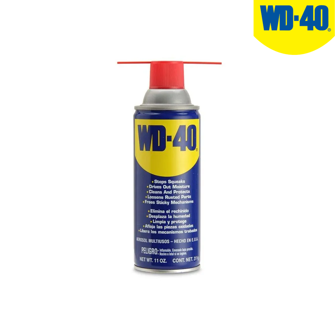 Lubricante multiuso WD-40, formulado para lubricar, aflojar, limpiar y proteger superficies metálicas. Su presentación de 11 oz (325 ml) es ideal para mantenimiento industrial, automotriz y doméstico, ayudando a eliminar la humedad, prevenir la corrosión y prolongar la vida útil de piezas y herramientas.