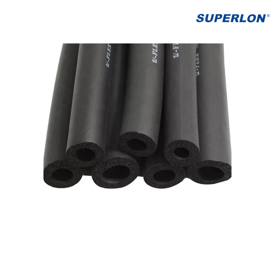 Manguera de aislamiento térmico Superlon, fabricada en espuma elastomérica de alta calidad, diseñada para reducir las pérdidas de energía y prevenir la condensación en tuberías de sistemas de refrigeración y aire acondicionado. Proporciona un aislamiento eficiente, flexible y de alta durabilidad para instalaciones profesionales.