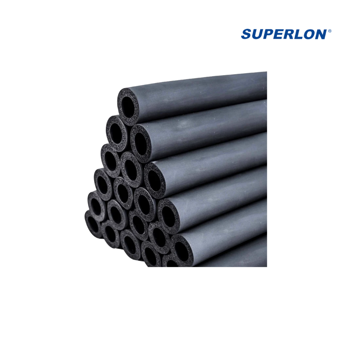 Manguera de aislamiento SUPERLON diseñada para tuberías de 1 5/8", con espesor de 3/4" y longitud de 1.80 metros. Ideal para sistemas de refrigeración y aire acondicionado, reduce pérdidas térmicas, evita la condensación y mejora la eficiencia energética del sistema.