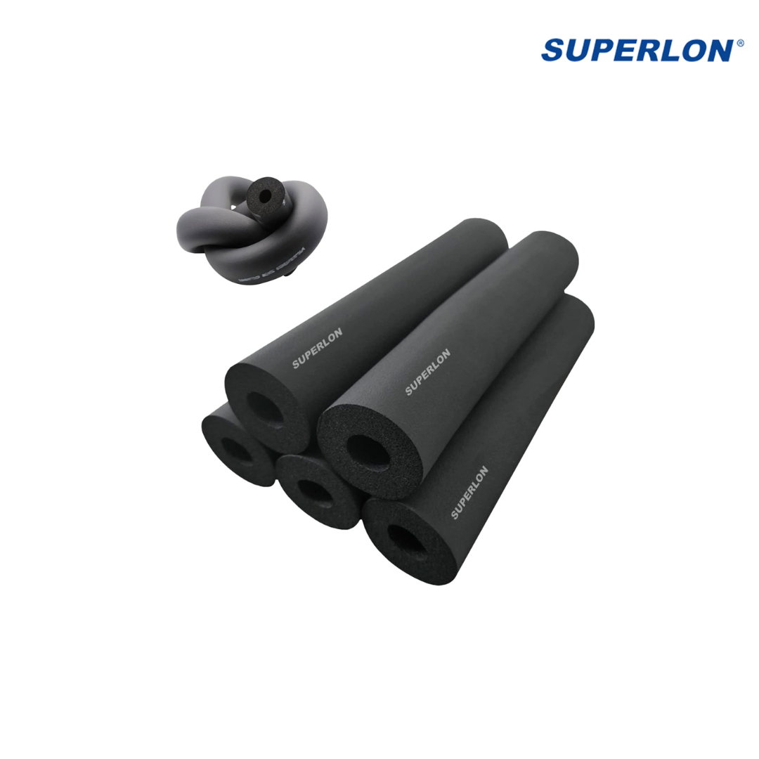 Manguera de aislamiento térmico Superlon, fabricada en espuma elastomérica de alta calidad, diseñada para reducir pérdidas de energía y prevenir la condensación en sistemas de refrigeración y aire acondicionado. Ideal para el aislamiento de tuberías de cobre, mejorando la eficiencia y prolongando la vida útil de la instalación.