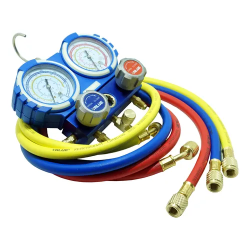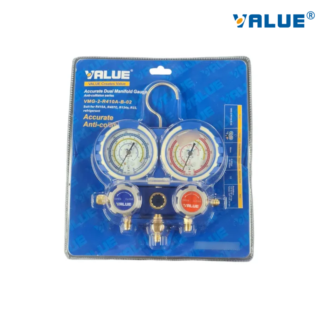 Manifold analógico VALUE modelo VMG-2-R410A-B-02, diseñado para trabajos de diagnóstico, carga y mantenimiento en sistemas de refrigeración y aire acondicionado con refrigerante R410A. Incluye mangueras, ofreciendo mediciones precisas de presión y un uso confiable para técnicos profesionales.