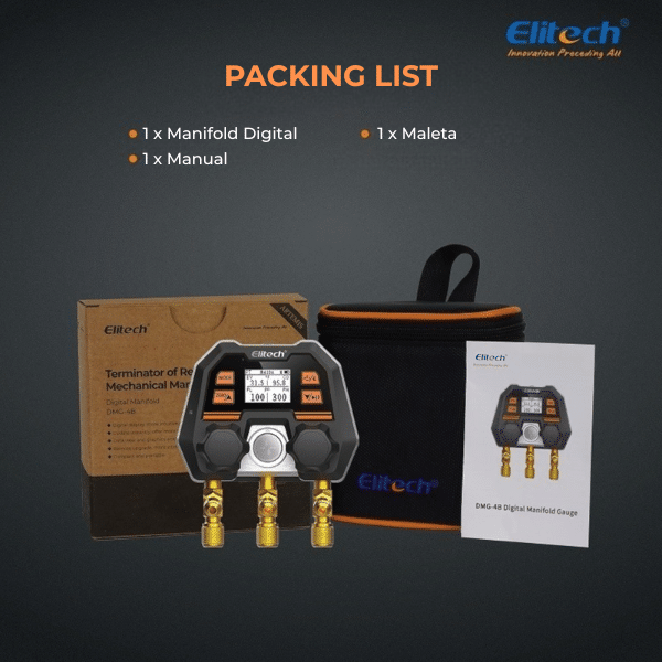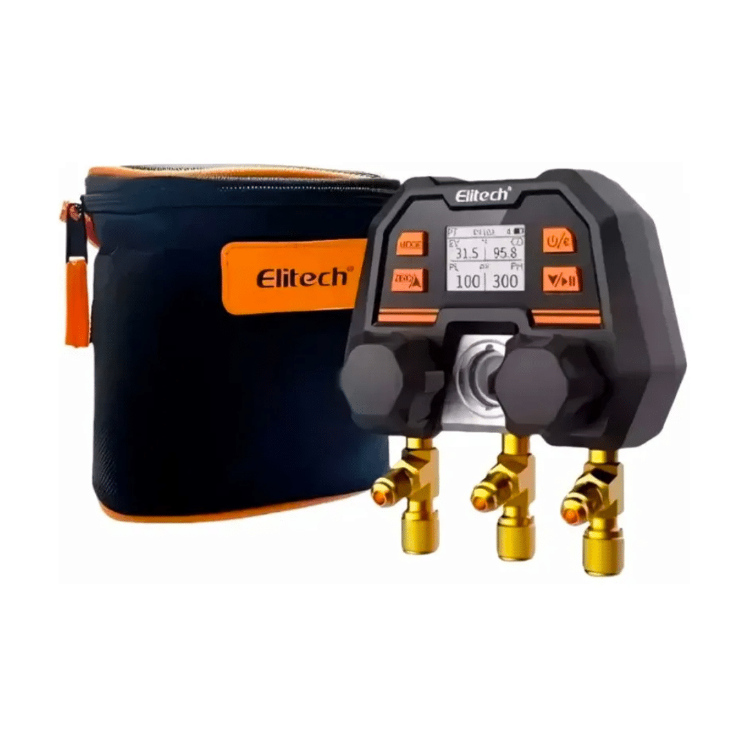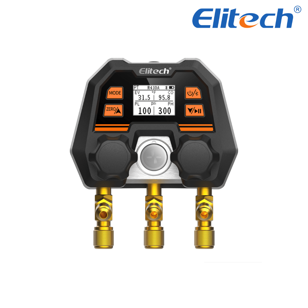 Elitech MS-100 es un manifold digital inteligente con múltiples modos de medición y conectividad móvil, ideal para inspecciones HVAC precisas y eficientes con compatibilidad para 140 refrigerantes.