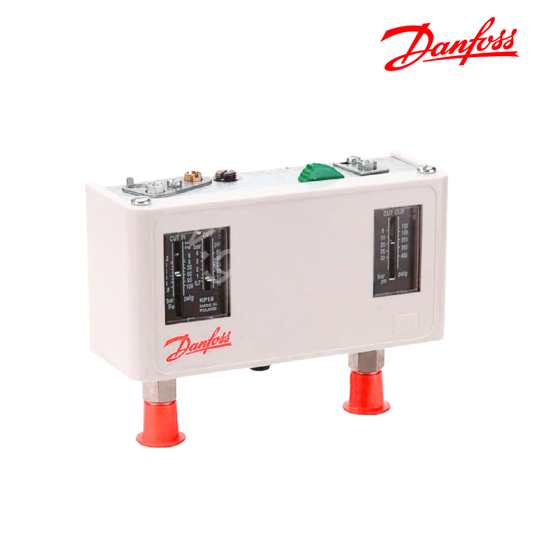 El presostato dual KP15 de Danfoss combina en un solo dispositivo el control de alta y baja presión, brindando una solución compacta y confiable para sistemas de refrigeración y aire acondicionado. Cuenta con rearme automático en baja presión y rearme manual en alta presión, ofreciendo una protección integral del compresor frente a condiciones críticas de operación.