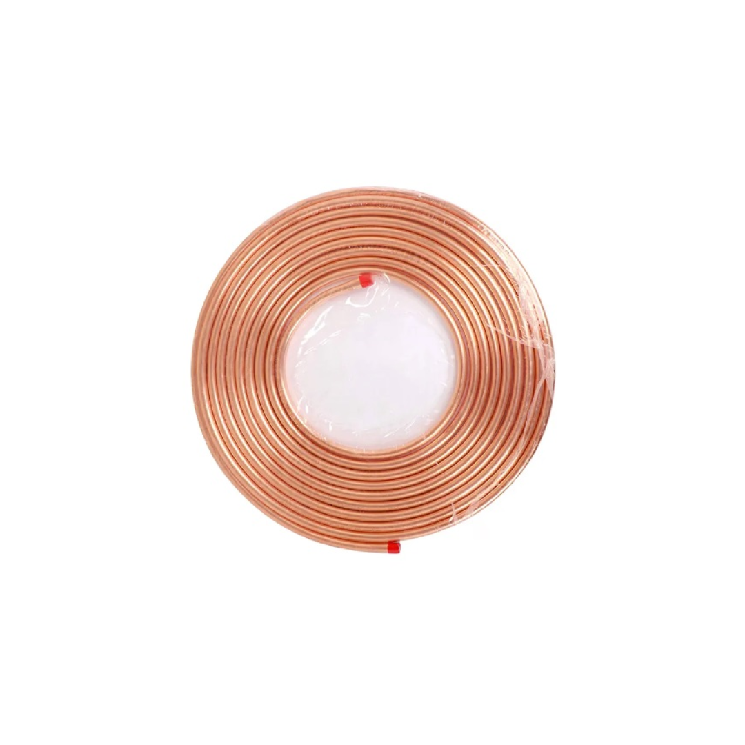 Rollo de tubería flexible de cobre 3/8", con espesor 0.64 mm y longitud de 15 metros, ideal para instalaciones de refrigeración, aire acondicionado, gas y sistemas hidráulicos. Su flexibilidad facilita la instalación, ofreciendo resistencia, durabilidad y un flujo eficiente y seguro.
