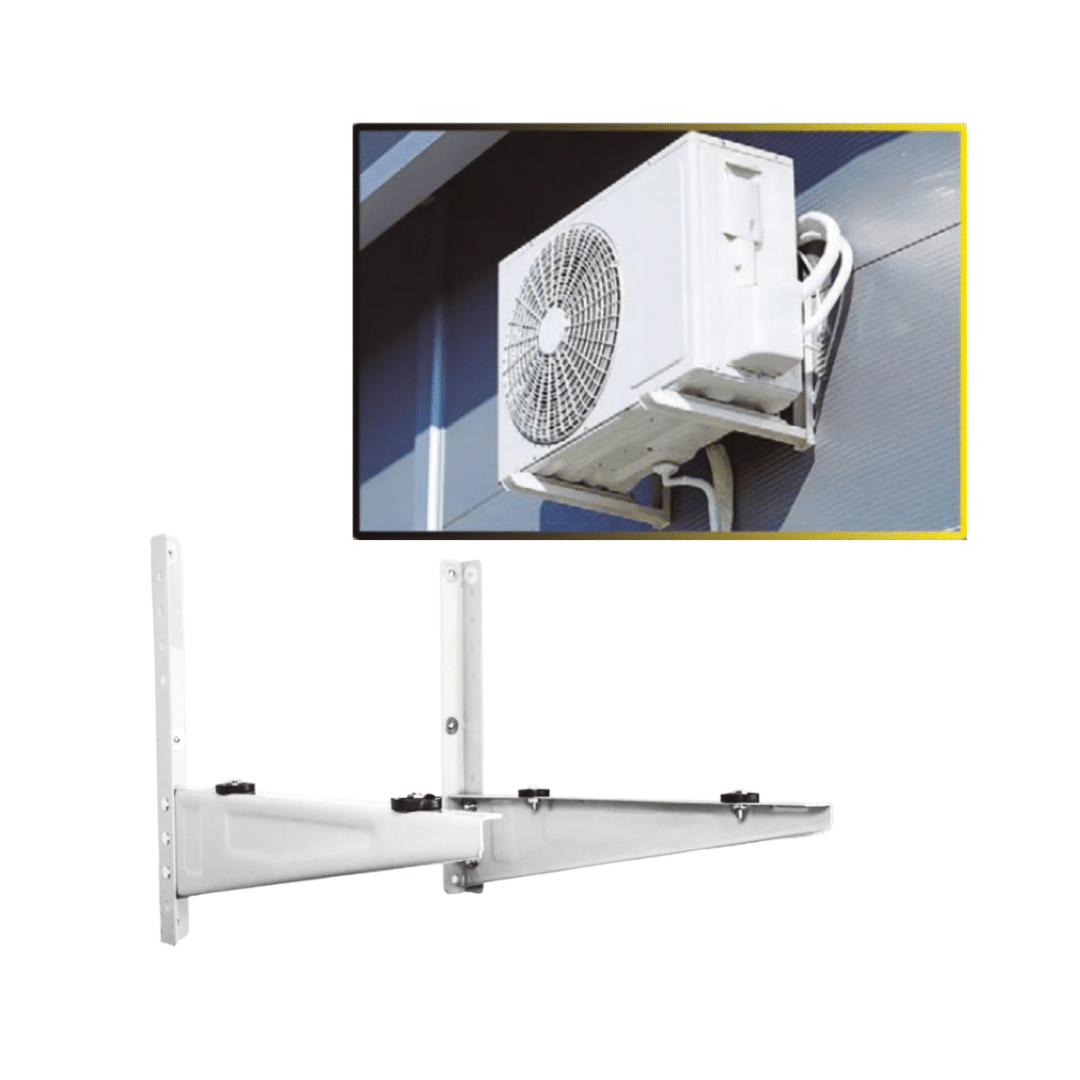 Soporte metálico resistente diseñado para la instalación segura de unidades condensadoras de aire acondicionado con capacidad entre 24,000 BTU. Fabricado con acero de alta resistencia y acabado anticorrosivo para mayor durabilidad en exteriores.