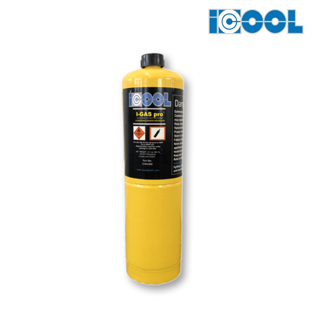 Tanque de gas MAP PRO de 400g de la marca ICOOL, especialmente formulado para alcanzar altas temperaturas en aplicaciones de soldadura, brasado, plomería y mantenimiento HVAC. Ideal para trabajos profesionales que requieren precisión y eficiencia térmica.