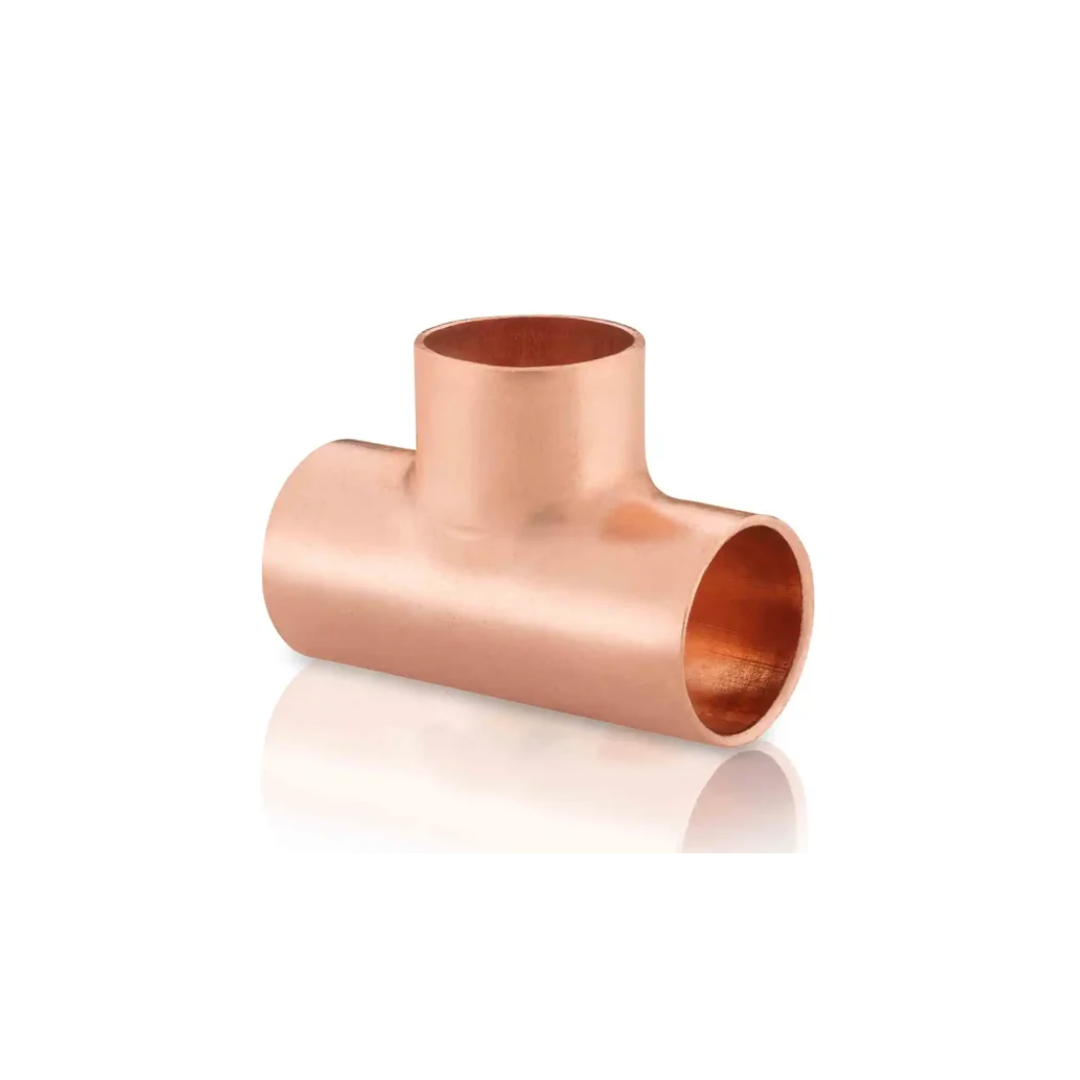 Tee de cobre soldable 1 3/8", diseñada para realizar derivaciones en sistemas de tuberías de cobre. Ideal para instalaciones de refrigeración, aire acondicionado, gas y sistemas hidráulicos, permite una conexión segura, resistente y duradera mediante soldadura.