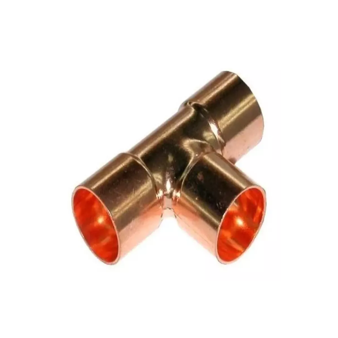 Tee de cobre soldable de 7/8", ideal para realizar derivaciones en sistemas de refrigeración, aire acondicionado y aplicaciones hidráulicas. Fabricada en cobre de alta calidad, ofrece excelente resistencia, conductividad térmica y uniones firmes y herméticas mediante soldadura.