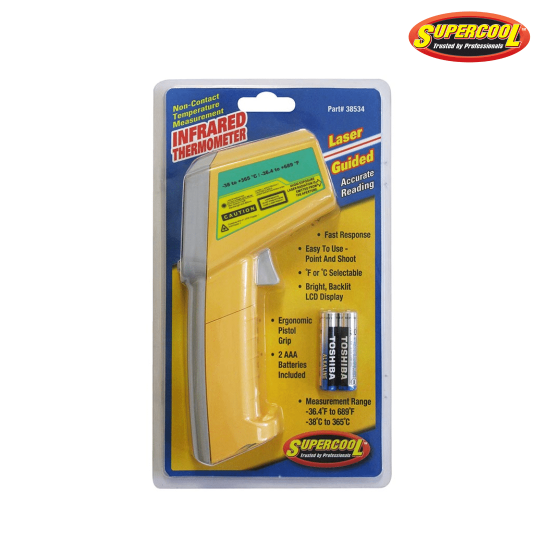 El Termómetro Digital Infrarrojo Láser SUPERCOOL 38534 es una herramienta precisa y práctica para la medición de temperatura sin contacto, ideal para aplicaciones en refrigeración, climatización, automotriz e industrial. Su tecnología infrarroja con puntero láser permite obtener lecturas rápidas y exactas incluso en superficies de difícil acceso.