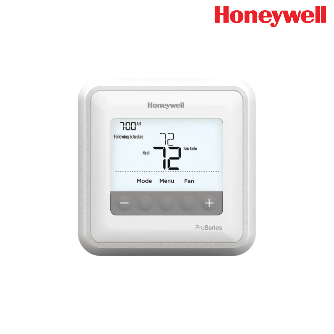Termostato digital programable Honeywell T4 Pro, diseñado para el control preciso y confiable de la temperatura en sistemas de calefacción y aire acondicionado. Permite programación semanal y ajustes automáticos para mejorar el confort y la eficiencia energética en ambientes residenciales y comerciales.
