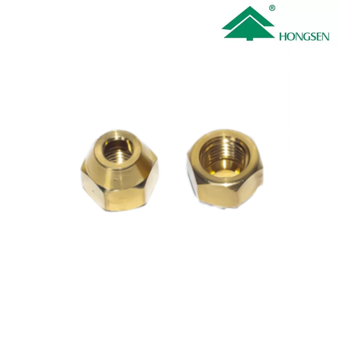Tuerca de bronce tipo flare de 1/2", marca HONGSEN, diseñada para ofrecer una conexión segura y hermética en sistemas de refrigeración y aire acondicionado. Fabricada en bronce de alta calidad, proporciona excelente resistencia a la corrosión y un sellado confiable en uniones flare.