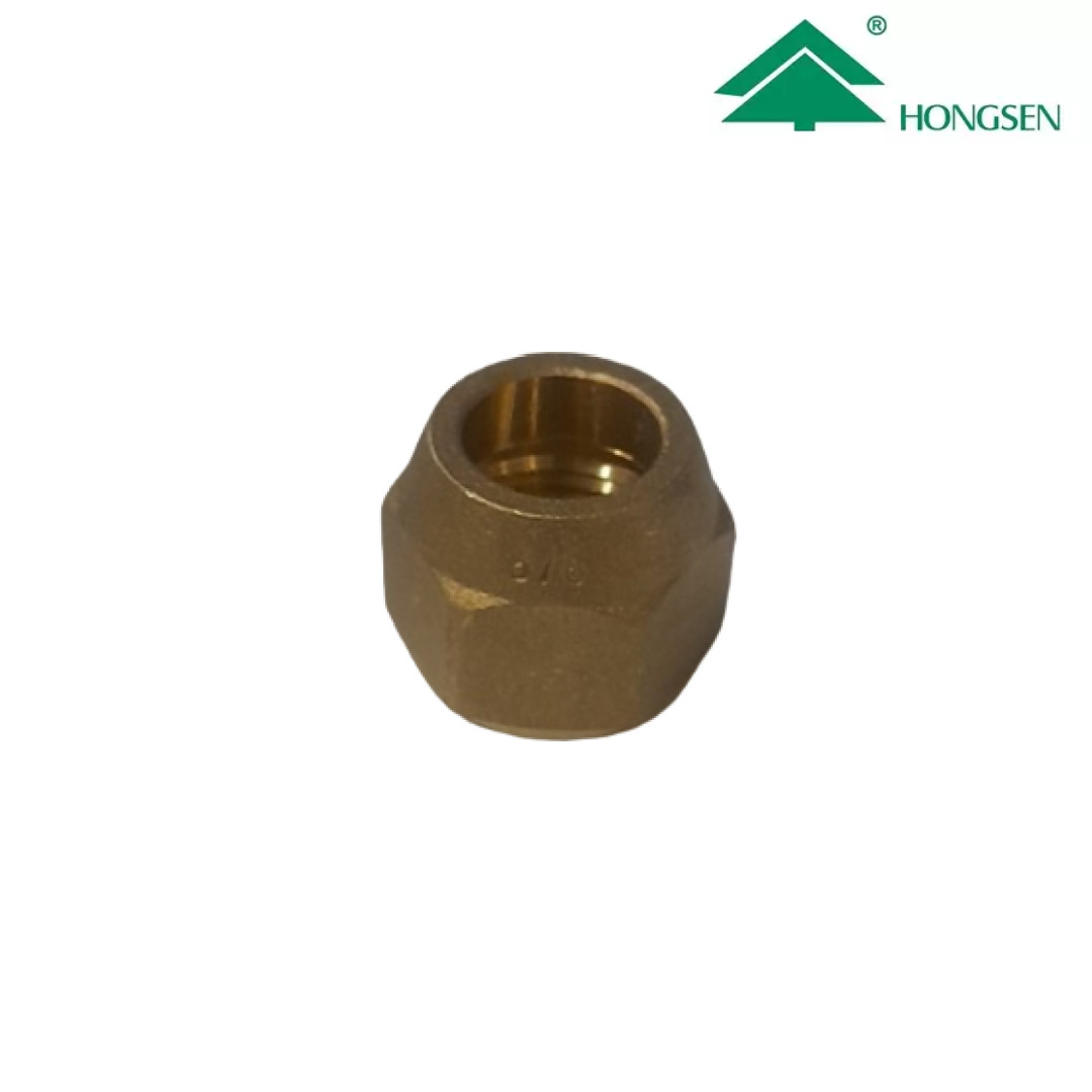 Tuerca de bronce tipo flare de 5/8", marca HONGSEN, diseñada para asegurar conexiones firmes y herméticas en sistemas de refrigeración y aire acondicionado. Su construcción en bronce de alta calidad ofrece excelente resistencia a la corrosión y un sellado confiable en uniones flare.