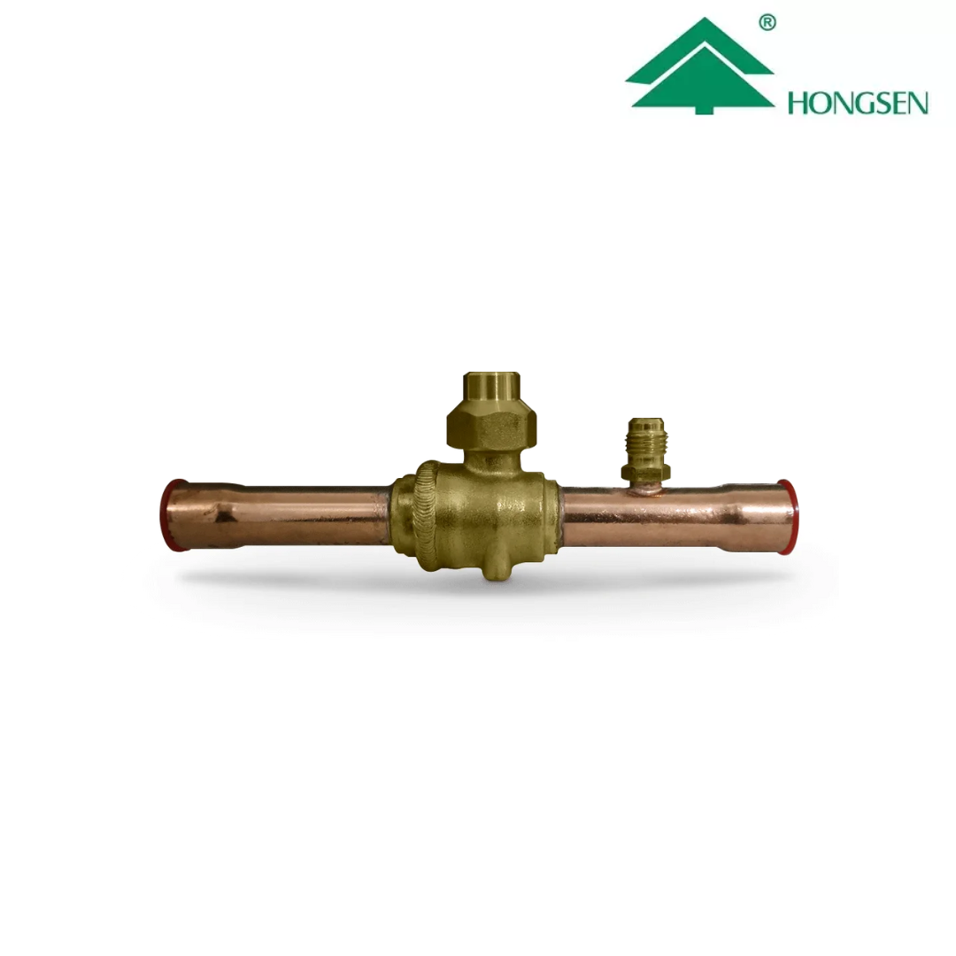 Válvula de bola con servicio HBC-28 de 1 1/8″, marca HONGSEN, diseñada para sistemas de refrigeración y aire acondicionado. Permite el control seguro del flujo del refrigerante y facilita las labores de mantenimiento, carga y recuperación del sistema de manera eficiente.