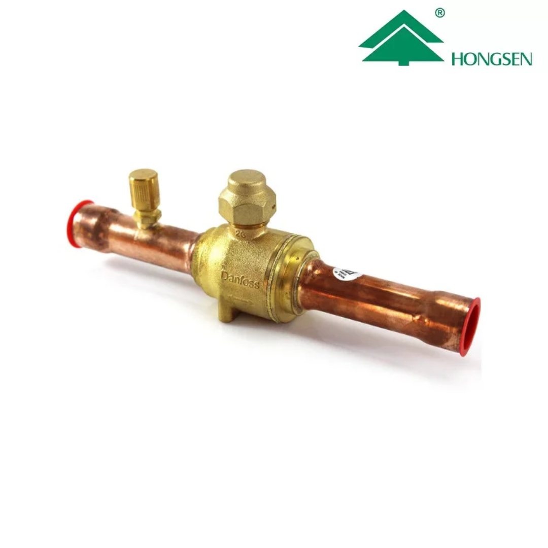 Válvula de bola con servicio HBC-54 de 2 1/8″, marca HONGSEN, diseñada para sistemas de refrigeración y aire acondicionado de gran capacidad. Permite el control seguro del flujo del refrigerante y facilita las operaciones de mantenimiento, carga y recuperación del sistema.
