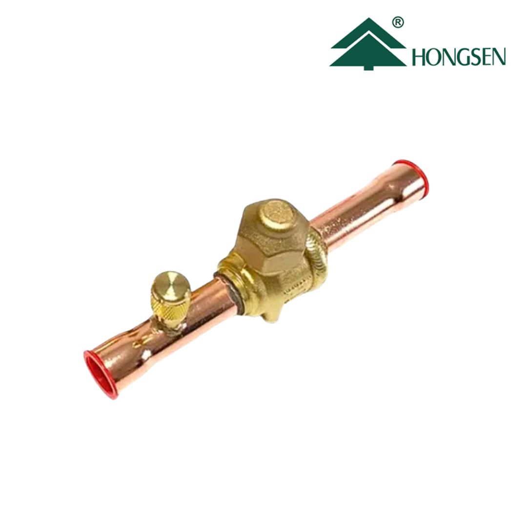 Válvula de bola con servicio HONGSEN modelo HBC-6, diseñada para sistemas de refrigeración y aire acondicionado. Su conexión 1/4″ permite un control seguro del flujo de refrigerante y facilita las labores de servicio, carga y mantenimiento del sistema.