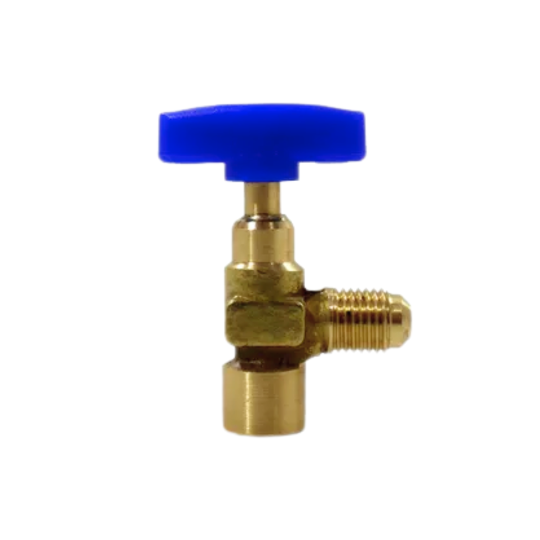 Válvula de carga de refrigerante diseñada para conectar de forma segura latas de refrigerante a las mangueras de los manifolds. Permite una carga controlada y precisa, ideal para trabajos de mantenimiento y servicio técnico en HVAC y refrigeración comercial.